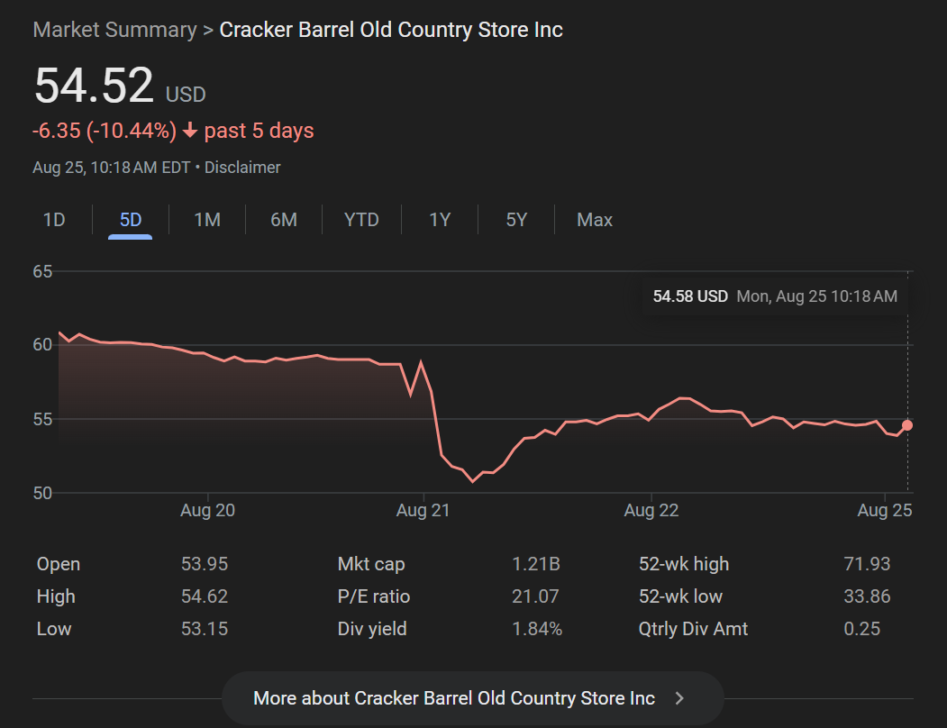 The rebrand announcement coincided with a sharp decline in Cracker Barrel's stock (CBRL), which dropped over 12% in a single day, erasing nearly $100 million in market value. This volatility highlights the risks of altering a well-established brand, especially in a competitive restaurant industry facing economic pressures.
