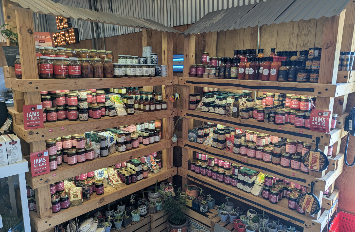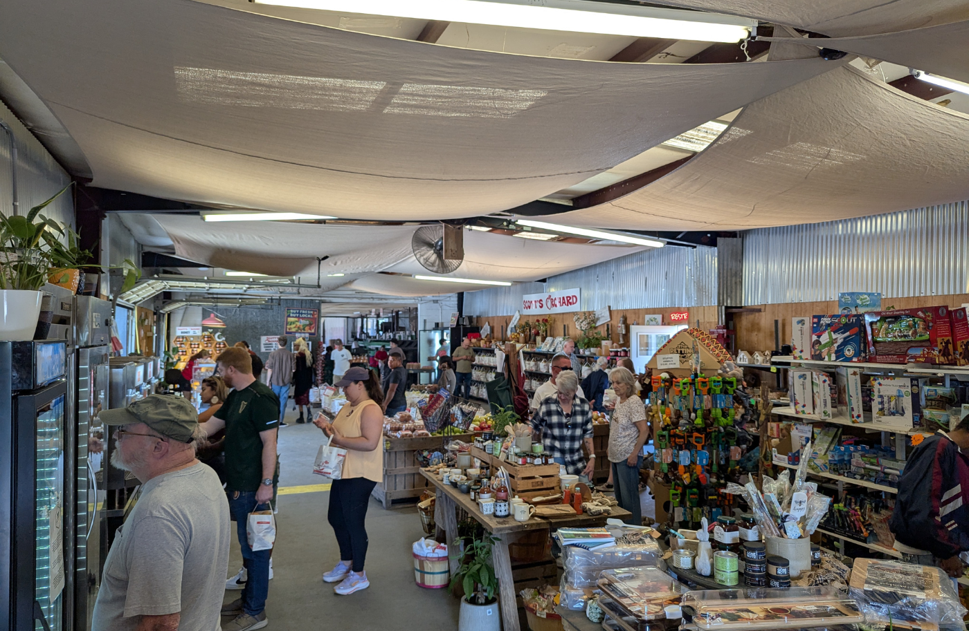 The farm store at Scott's Orchard acts as a central marketplace for fresh goods, open Monday to Saturday from 8 a.m. to 5 p.m. and Sundays from 1 p.m. to 5 p.m. Inside, shoppers encounter crates of red and green apples, chilled displays with $15 whole pies, $10 lunch boxes, and jugs of apple cider. The selection extends to apple slushies, an assortment of jams and jellies in various flavors on rustic shelves, plus honey and other preserves sourced locally.