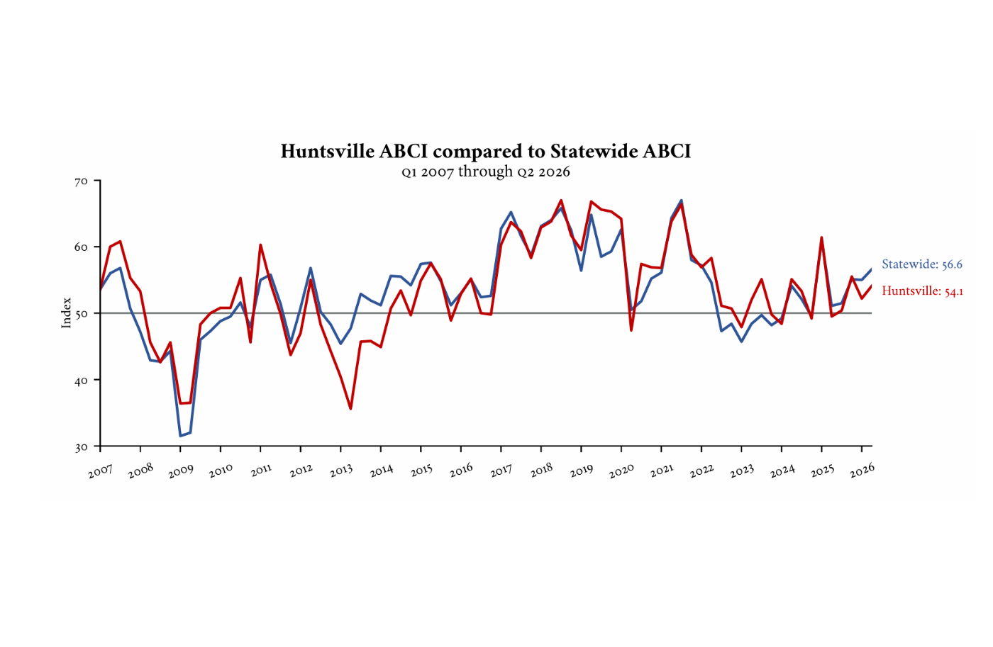 Business leaders across Alabama and the Huntsville metropolitan area are entering the second quarter of 2026 with a bolstered sense of optimism. According to the latest Alabama Business Confidence Index (ABCI) released by the Center for Business and Economic Research (CBER) at the University of Alabama, the statewide composite index rose to 56.6, marking a 1.6-point increase from the previous quarter. This growth signals a continued expansionary outlook as the index remains well above the neutral 50-point threshold, indicating that executives expect improved economic conditions compared to the first quarter of the year.