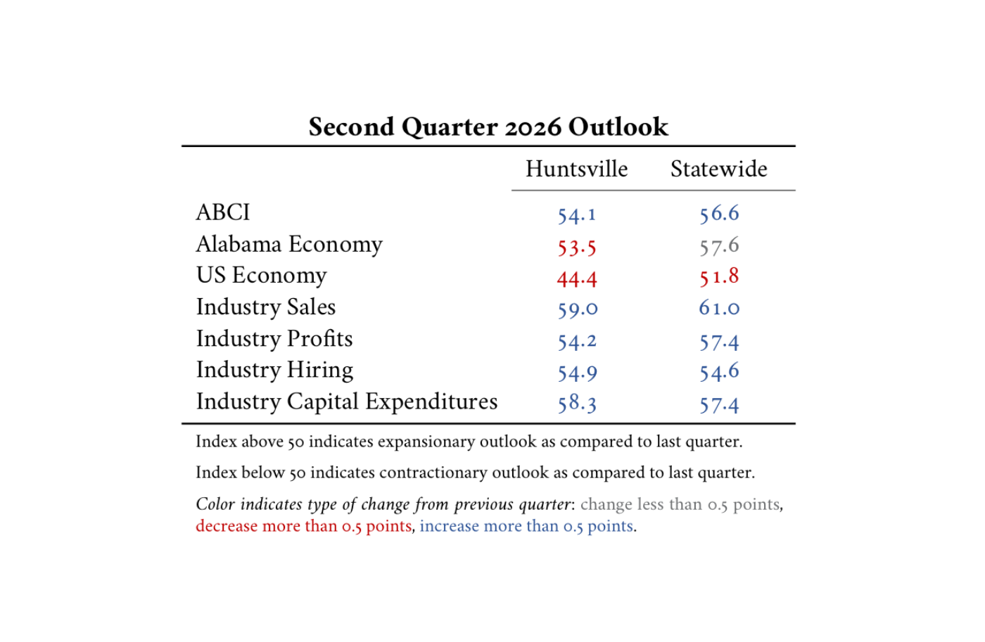 Ultimately, the Second Quarter 2026 ABCI reports depict a Huntsville business community that is thriving internally despite a cautious eye on Washington D.C. and the national markets. With sustained sales growth and a renewed commitment to capital expenditures, Huntsville remains a primary engine for Alabama’s economic stability as the state navigates the mid-point of the year.