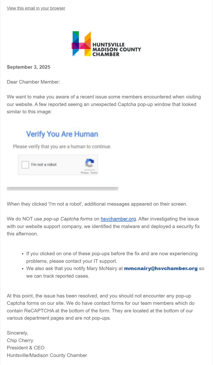 Keywords: Huntsville Chamber of Commerce, website malware, Captcha pop-up, cybersecurity, hsvchamber.org, Huntsville business news, website security fix