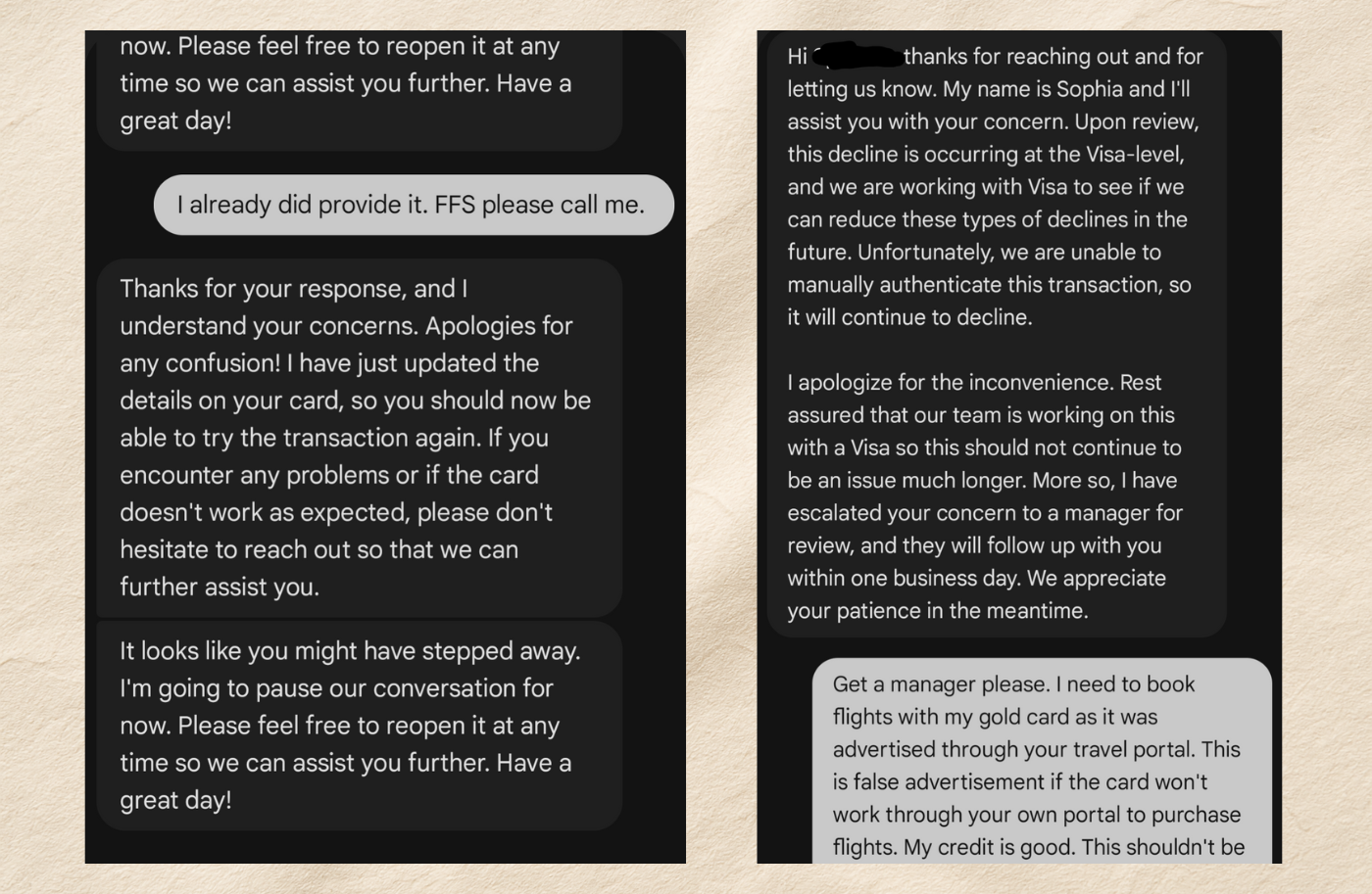 Cardholders facing urgent issues—such as fraud alerts, declined large transactions, or travel emergencies—report getting stuck in automated "loops" with no path to a reliable human agent. Users have described the experience as a "nightmare," alleging that when they do request a callback, they are often ghosted. For a premium financial product, the inability to call a known number and speak to a representative immediately is a glaring failure that leaves customers vulnerable when they need help the most.
